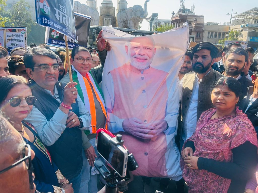 मोदी सरकार द्वारा संवैधानिक संस्थाओं ईडी और सीबीआई के कथित दुरुपयोग कर विपक्षी नेताओं पर झूठे मुकदमे दर्ज कर डराने-धमकाने की नीति के विरोध में पीसीसी के निर्देश पर बुधवार दोपहर 12:30 बजे शहर एवं देहात कांग्रेस कमेटी के संयुक्त तत्वावधान में नयापुरा स्थित जिला कलेक्ट्रेट कार्यालय के बाहर विरोध प्रदर्शन किया गया। प्रदर्शन के दौरान प्रधानमंत्री नरेंद्र मोदी का पुतला दहन कर कांग्रेस कार्यकर्ताओं ने आक्रोश व्यक्त किया।