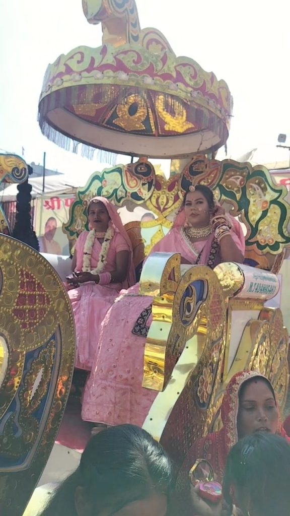 दोपहर में कन्याओं की सजी-धजी बग्गियों तथा दूल्हों की घोड़ियों पर भव्य बिंदोरी निकाली गई। बैंड-बाजों की मधुर धुन, पुष्पवर्षा और उत्साहपूर्ण वातावरण के बीच परिजन व समाजजन नाचते-गाते बारात के साथ आगे बढ़ते रहे। मार्ग में विभिन्न स्थानों पर श्रद्धालुओं ने बारात का स्वागत कर नवयुगलों को शुभकामनाएं दीं, जिससे पूरा शहर उत्सव की भावना में रंगा दिखाई दिया।
