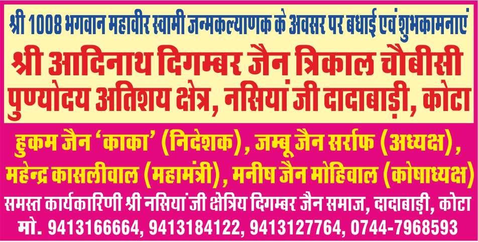श्री भगवान महावीर स्वामी के पावन जन्मकल्याणक महामहोत्सव के अवसर पर 30 मार्च, सोमवार (चैत्र शुक्ल त्रयोदशी) को पुण्योदय अतिशय क्षेत्र नसियां जी दादाबाड़ी में दिनभर भव्य धार्मिक एवं सांस्कृतिक कार्यक्रमों की श्रृंखला आयोजित की जाएगी। आयोजन को लेकर समूचे जैन समाज में उल्लास और उत्साह का वातावरण बना हुआ है।